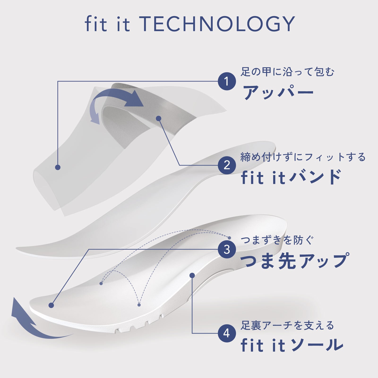 甲をホールドするfit itバンドにより崩れがちな横アーチもサポート。アーチ構造を正しく整えることで感じる、足裏をリセットするような気持ち良さ。